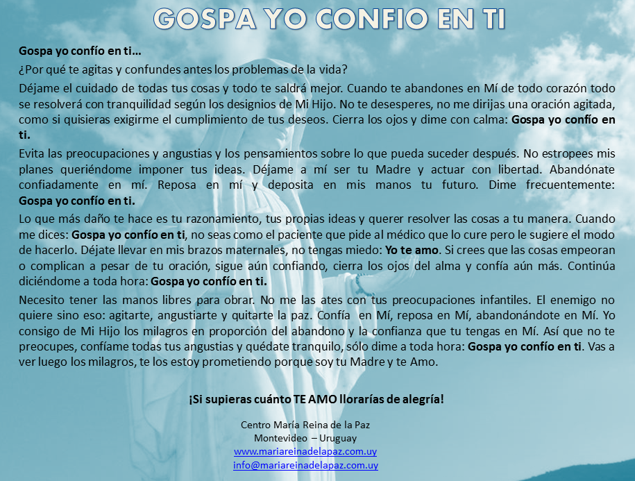 1. CREO EN LA APARICIÓN DE LA GOSPA: REINA DE LA PAZ,TAMBIÉN CREO QUE ES LA INTERMEDIARIA ENTRE NOSOTROS Y JESÚS.TE AMO MADRE!!!BEATRIZ BOCANERA