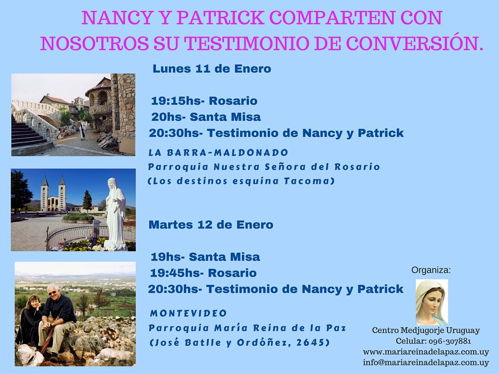 Nancy y Patrick estarán en Uruguay los próximos días en el marco de la visita que realizarán por algunos países de Latinoamérica. Darán una conferencia en Punta del Este el día lunes 11 de enero en la Parroquia de la Barra y otra en Montevideo el martes 12 de enero en la Parroquia María Reina de la Paz.