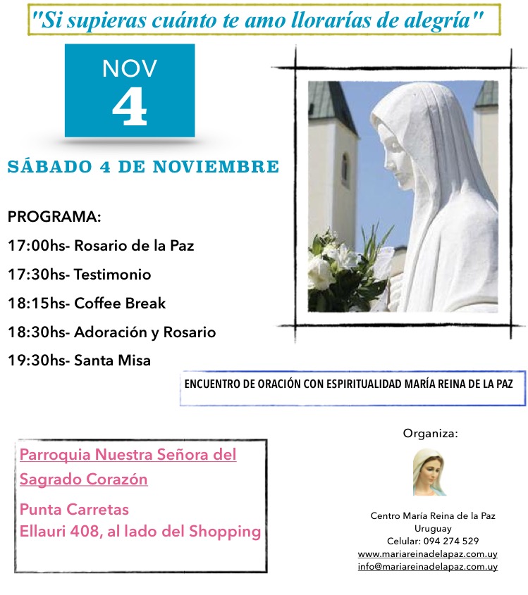 El próximo sábado 4 de noviembre a partir de las 17hs tendremos una tarde de espiritualidad de Medjugorje en la Parroquia Punta Carretas en Montevideo, Uruguay.