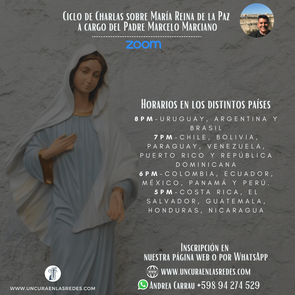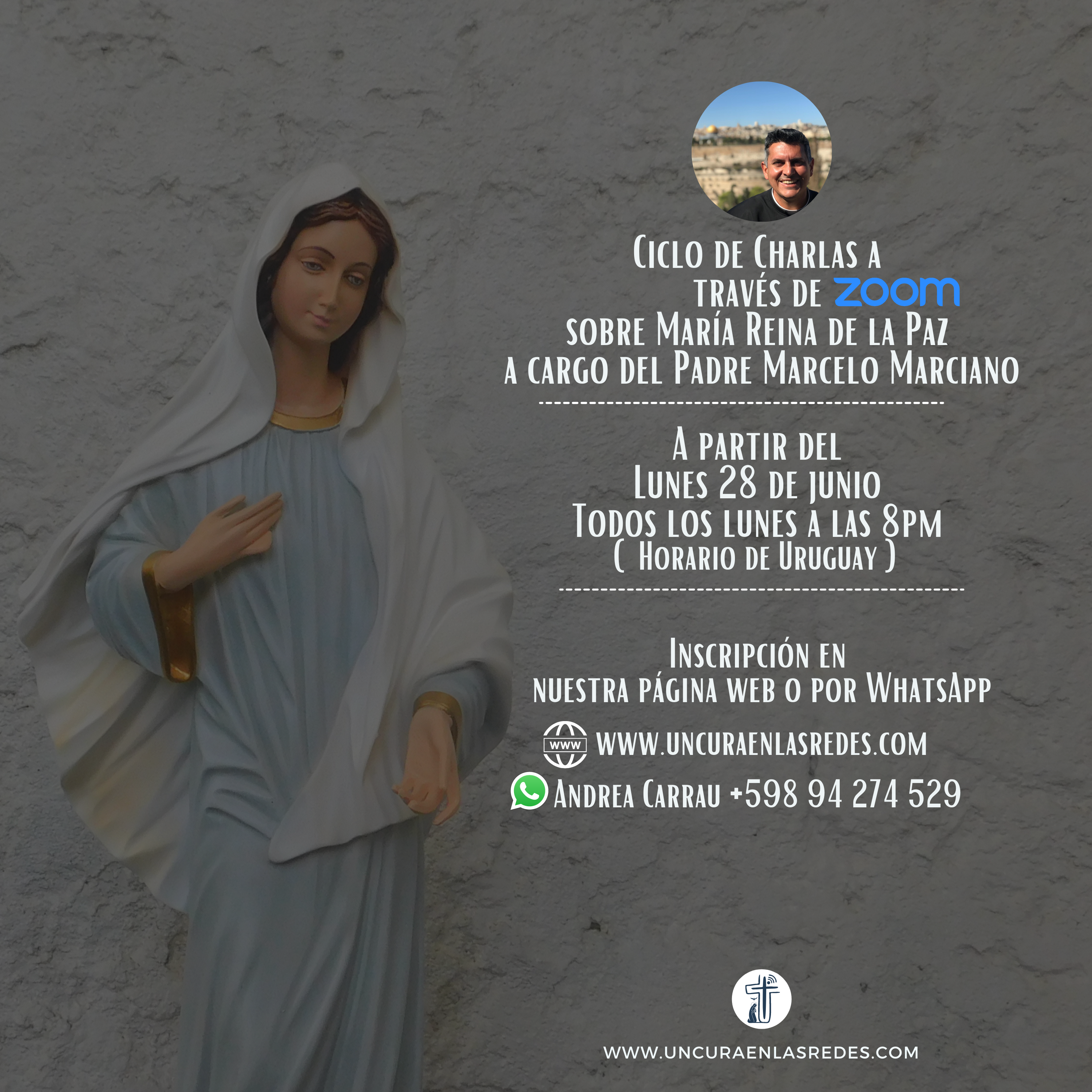 A partir del próximo lunes 28 de junio comenzaremos un Ciclo de charlas a través de Zoom sobre María Reina de la Paz. Las charlas estarán a cargo del Padre Marcelo Marciano.