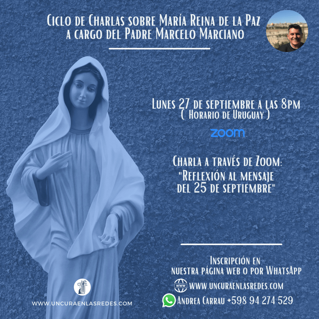El lunes 27 de septiembre el Padre Marcelo Marciano hará la reflexión al mensaje dado por la Virgen en Medjugorje el pasado 25 de septiembre. La reflexión será en vivo a través de Zoom