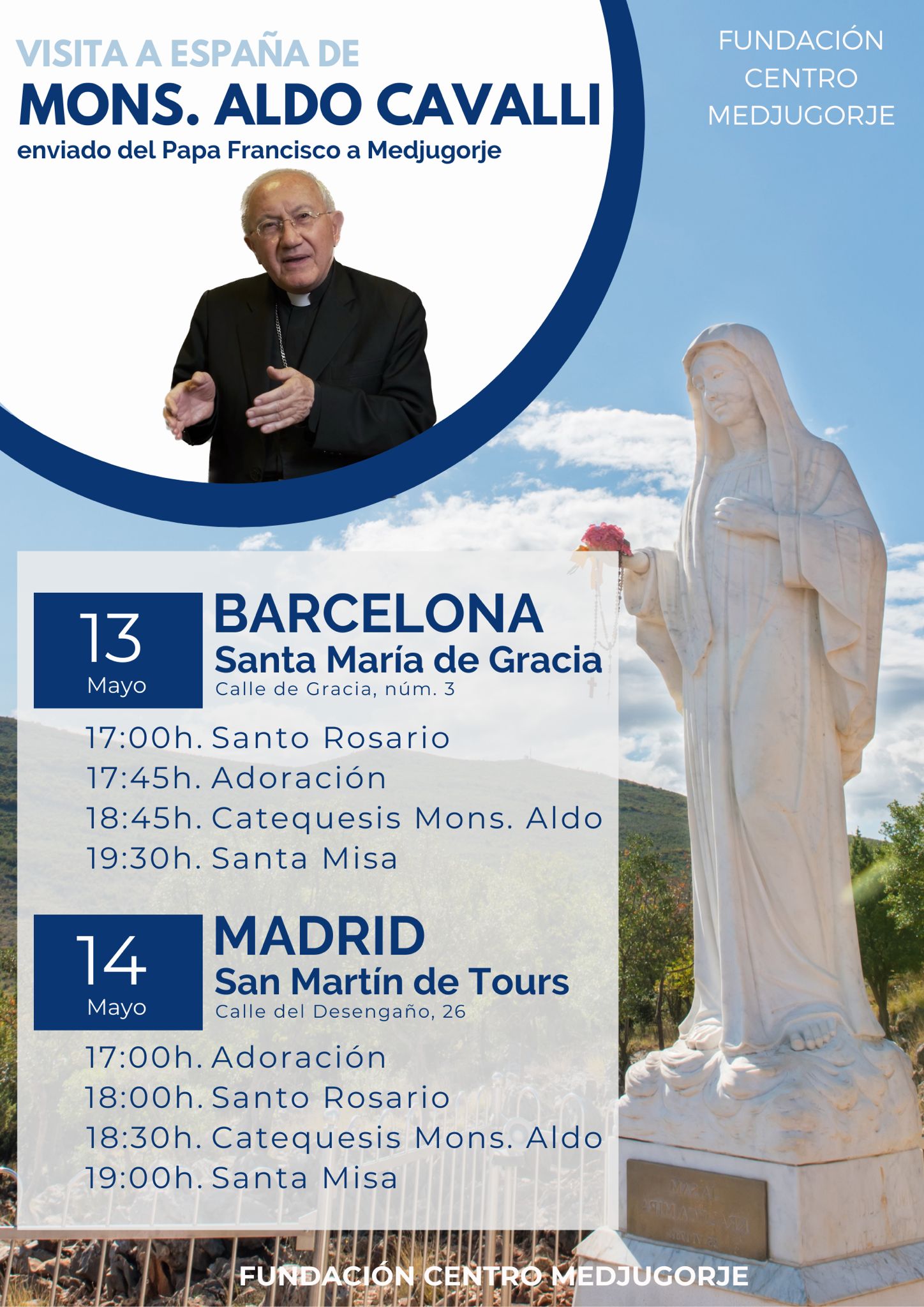 El Enviado del Papa Francisco en Medjugorje, el italiano Mons. Aldo Cavalli, visitará España entre los días 12 al 14 de mayo, atendiendo a la invitación personal que el presidente de la Conferencia Episcopal Española, y cardenal de Barcelona, Mons. Juan José Omella, le hizo durante el pasado mes de agosto con motivo de la celebración anual del Festival de la Juventud.
