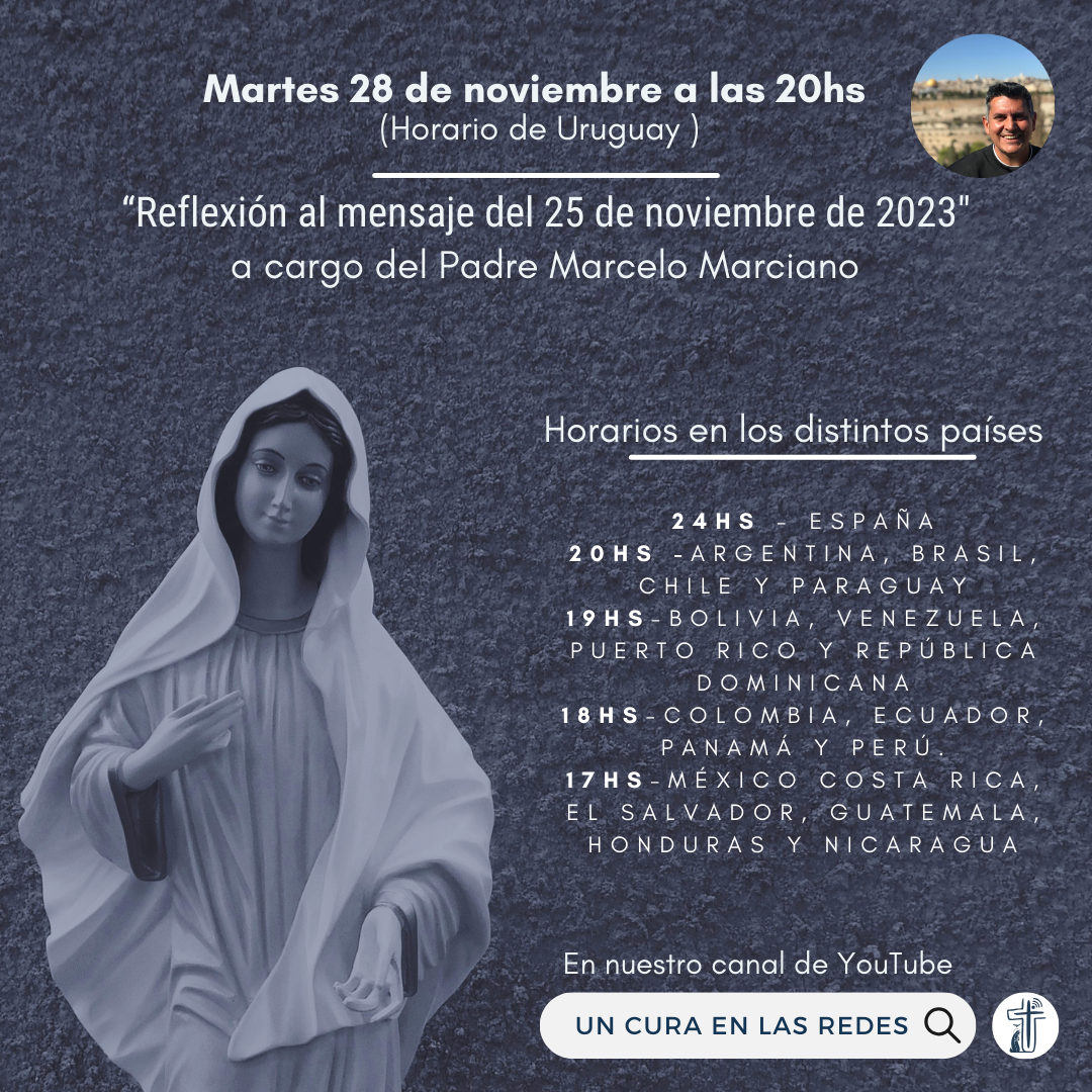 Este martes 28 de noviembre a las 20hs de Uruguay el Padre Marcelo Marciano comentará a través de YouTube el mensaje dado por la Virgen el pasado 25 de noviembre.