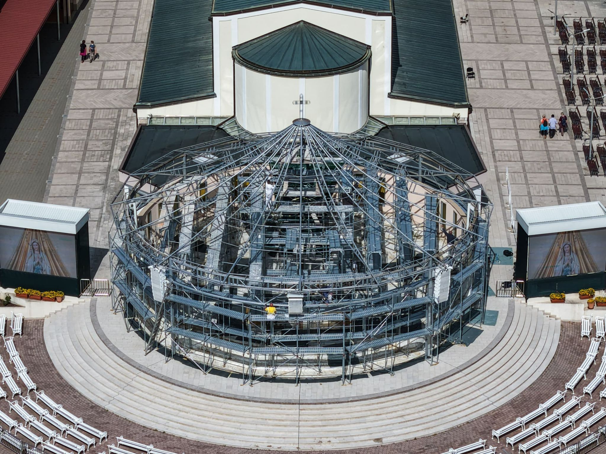 Las obras en curso incluyen la sustitución de la antigua lona y la mejora de la estructura, como parte del mantenimiento del espacio para las celebraciones litúrgicas.