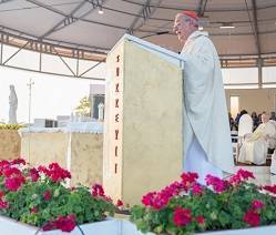 “Estoy agradecido con Dios y con todos ustedes por la invitación a presidir esta Eucaristía al comienzo del 30º Festival de la Juventud. A todos les transmito el saludo cordial y la bendición del Papa Francisco”. Refiriéndome al lema del festival de la juventud de este año, nos reunidos para la Eucaristía bajo la mirada de la Madre de Dios, quedamos asombrados por la gracia que el Señor nos derrama continuamente. Todo es gracia: el don de la Iglesia, de la Palabra y del Pan, la belleza de la creación y el rostro de los hermanos. El Buen Padre quiere que sigamos al Hijo para encontrar la dicha. Dios no es un reclutador de personal sino la fuente de la vida y quiere que todos vivan plenamente. Seguimos al Señor porque hemos creído que solo Él trae la vida. El discipulado no tiene edad, no pide ser bueno o haber llegado a serlo. ¡Es gratis, porque el buen Padre ama la olla de barro que somos! No hay planes de estudio para presentar. Esto nos llena de alegría, pero también elimina todas las coartadas: nadie puede decir que no son adecuados para la santidad en nombre de sus errores y sus debilidades. ¡El discípulo teme los atajos, no los pecados!