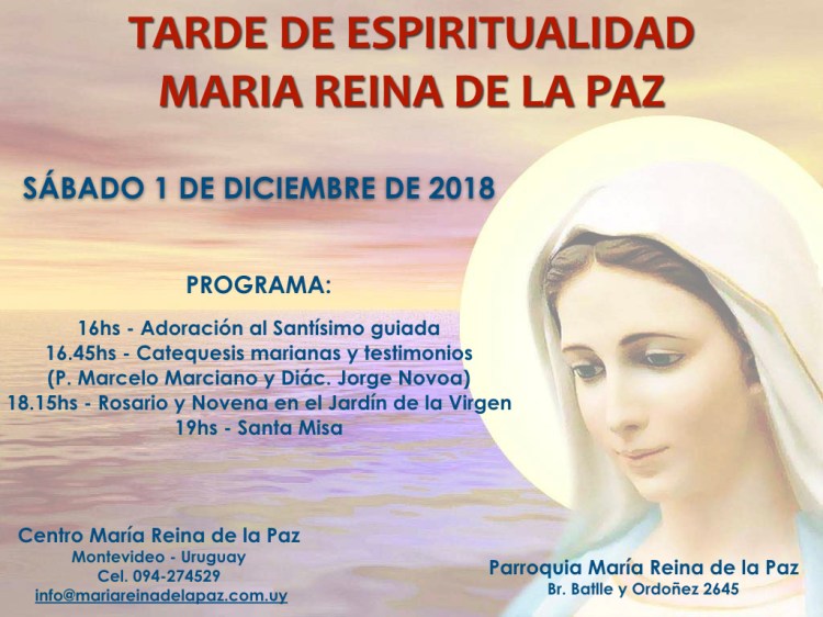 En este caso no será en la Parroquia de Punta Carretas sino que tendremos una jornada de espiritualidad en la PARROQUIA MARÍA REINA DE LA PAZ (Br. Batlle y Ordóñez ex-Propios 2645).