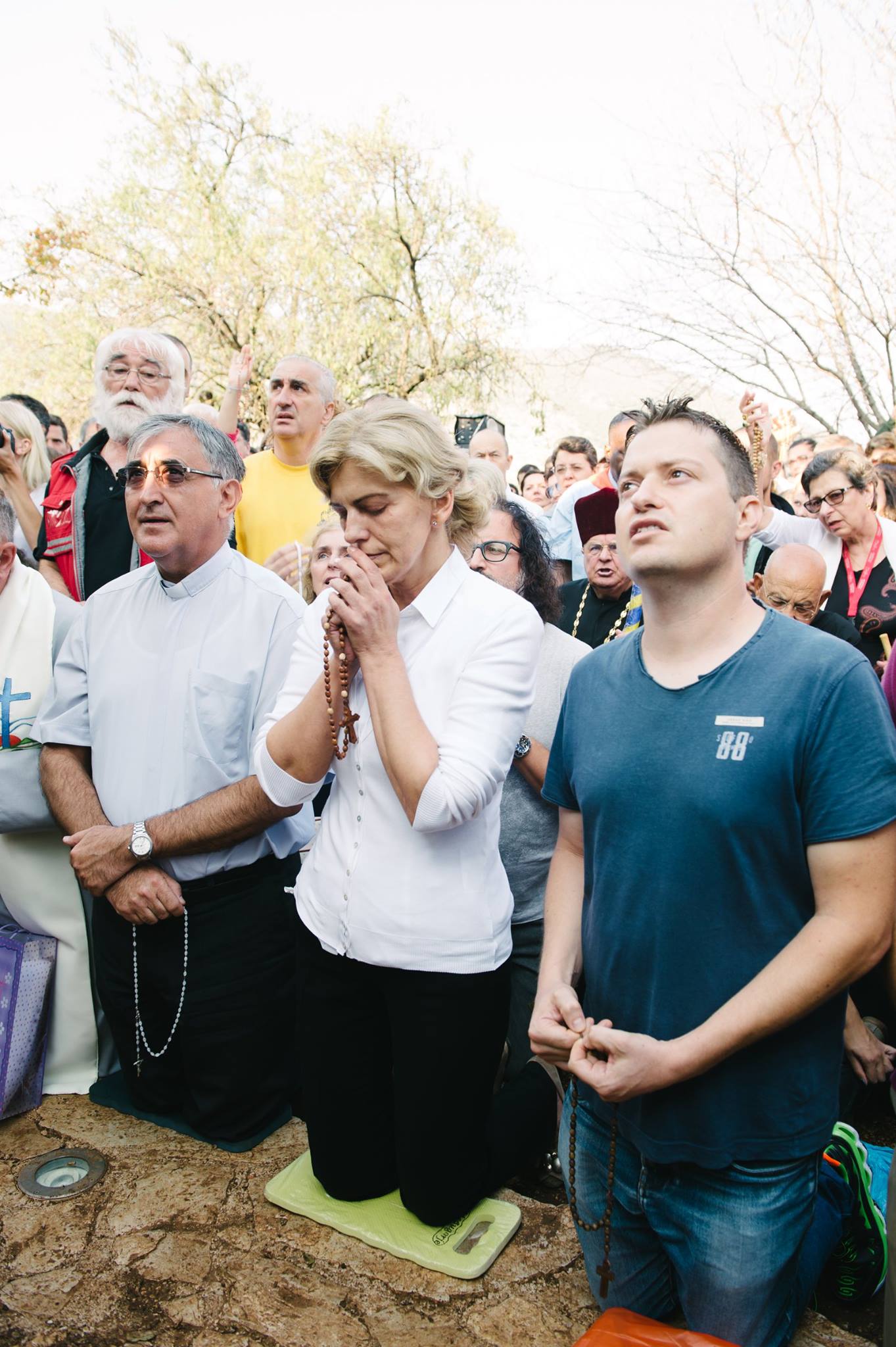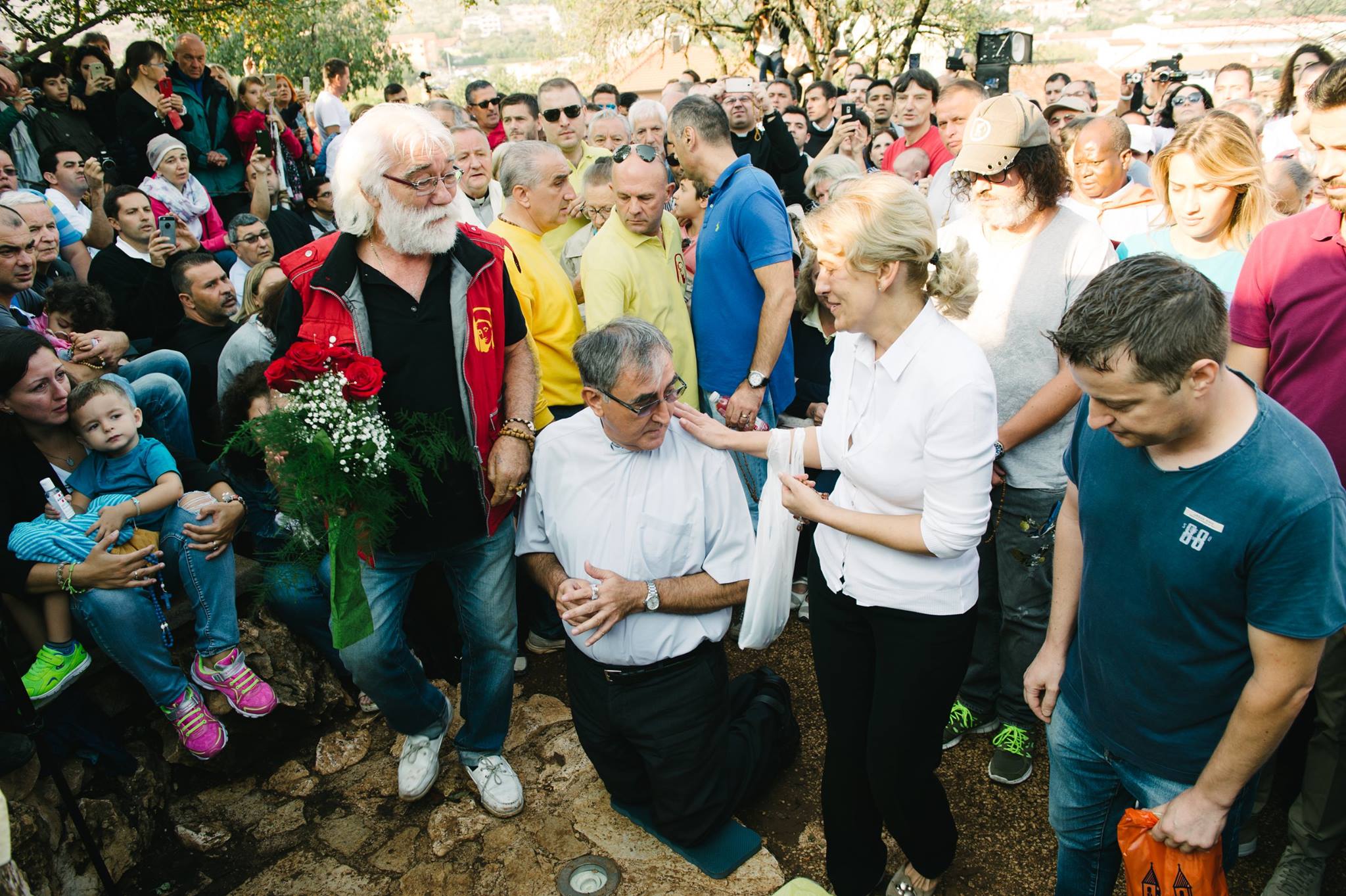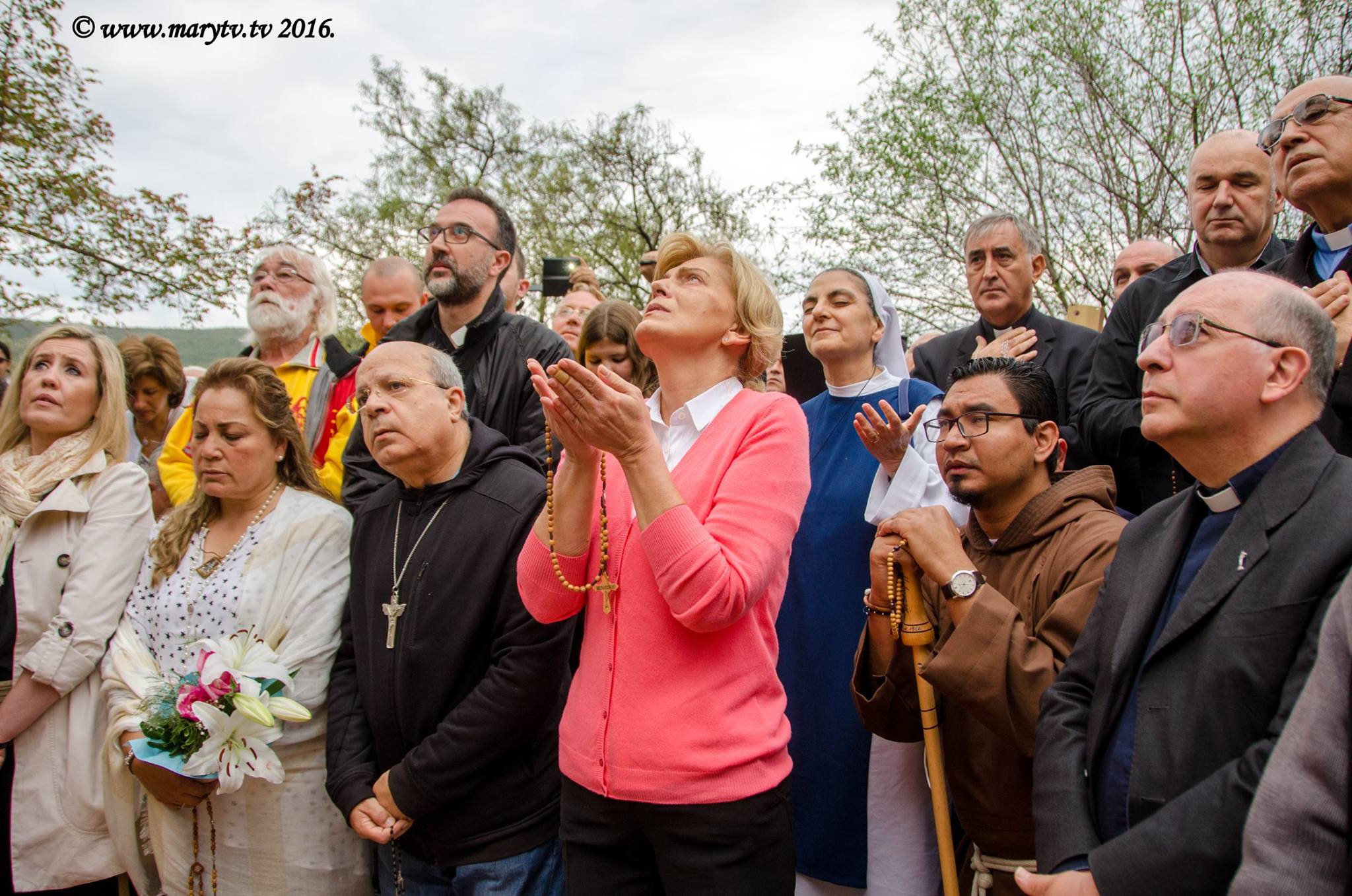 Después fuimos hacia el Monte de las Apariciones. Las nubes grises de lluvia se despejaron sólo y exclusivamente en el espacio de cielo que estaba sobre el Podbrbo. Comenzamos con el primero de los misterios gozosos. Cuando llegamos ante la imagen de la Virgen, rompí a llorar, nos abrazamos, y le dije a la Virgen: “Te prometí que vendría a darte las gracias y aquí estoy, con la mujer de mi vida, para que la conozcas; ¡gracias!”