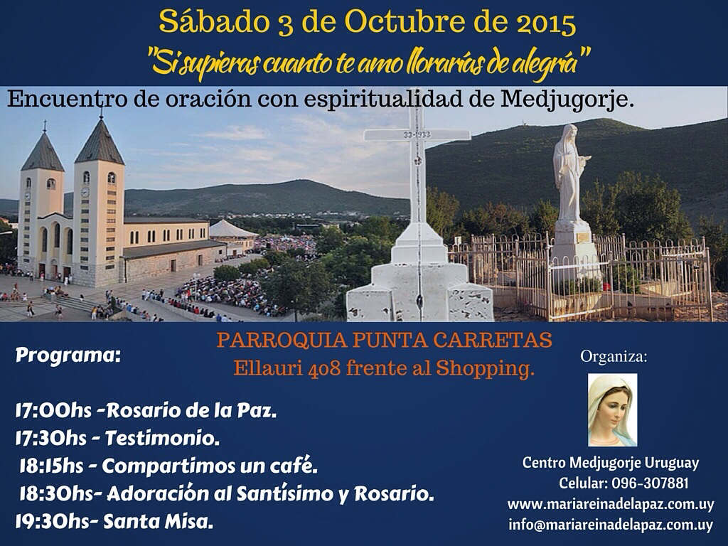 El próximo sábado 3 de octubre de 2015 tendremos encuentro de oración con espiritualidad de Medjugorje en la Parroquia de Punta Carretas.