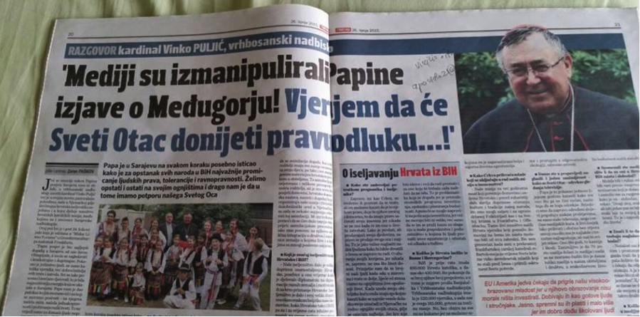 Lunes, 29 de junio. El periódico croata 7 Dnveno, publica una entrevista al cardenal Vinko Puljic, arzobispo de Sarajevo, quien remata las informaciones falsas referidas: «Doctrina de la Fe no ha emitido ningún documento contrario a Medjugorje».