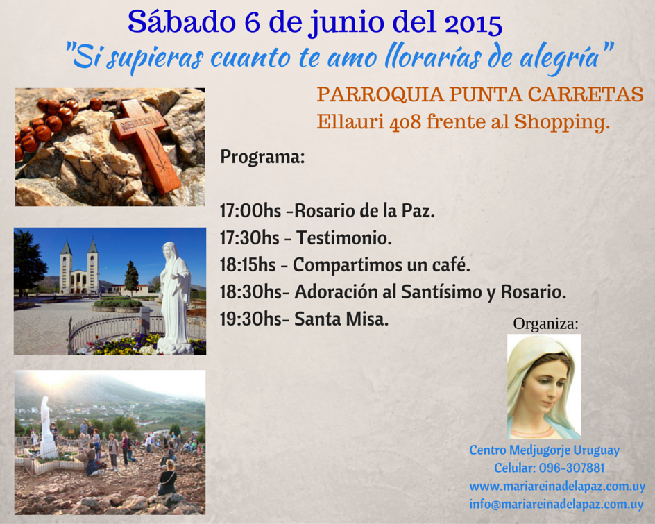 El próximo sábado 6 de junio tendremos encuentro de oración con espiritualidad de Medjugorje en la Parroquia de Punta Carretas.