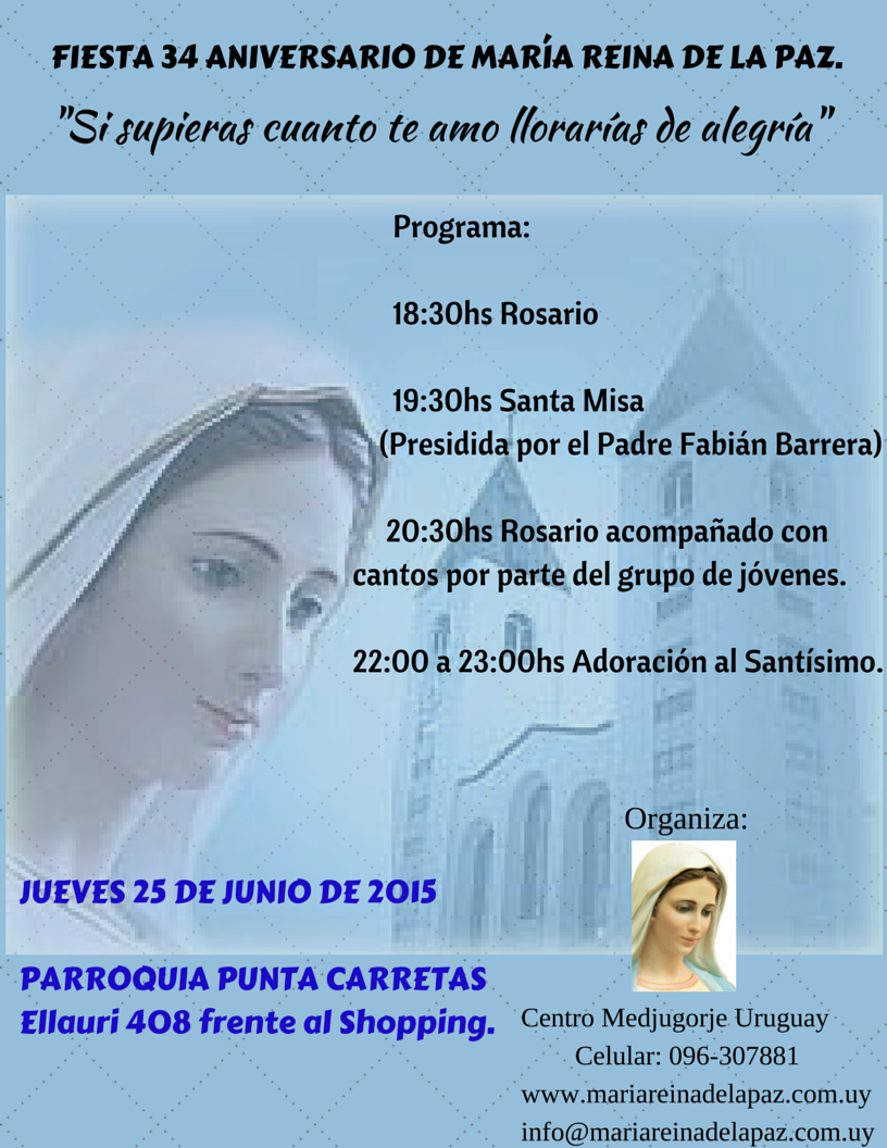 Es un verdadero regalo de Dios contarles que el Centro Maria Reina de la Paz en Uruguay ha organizado la Fiesta del 34º Aniversario de las Apariciones de la Virgen en Medjugorje en dos lugares distintos. Le damos gracias a Dios porque la Virgen conduce cada vez más hijos hacia el encuentro de Su Hijo Jesús.