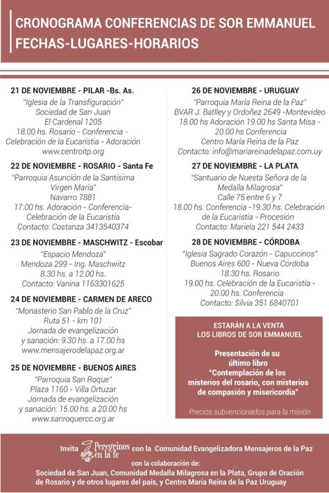 22/11 – Rosario, Santa Fe – 17:00Parroquia Asunción de la Sma. Virgen María – Navarro 7881 – (Adoración – Conferencia – Misa). Contacto: Costanza 0341 354 0374
