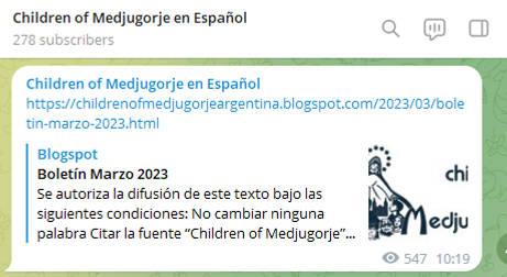 El Boletín mensual de Children of Medjugorje, los mensajes de la Gospa del 25 de cada mes, los audios y anuncios, también están disponibles por Telegram, ingresando al grupo: Children of Medjugorje en español y Canal de YouTube: Sor Emmanuel Maillard-español