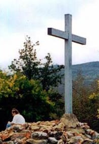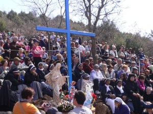 La estatua de la Virgen María al lado de la nueva Cruz Azul que se puso para acomodar mejor a la multitud. El 18 de Mayo, la primera aparición pública del vidente Ivan Dragicevic fue seguida por miles de personas. El retorno de Ivan de USA significa más apariciones públicas en Medjugorje, y se señala como punto de ventaja para el aniversario en Junio.