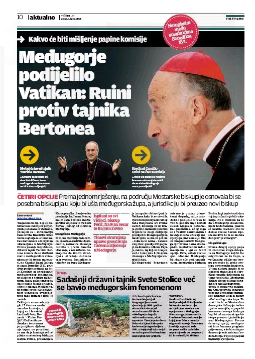 Una página completa ha dedicado el pasado Viernes, Jun-01-2012, el principal diario de Croacia, Večernji List, a presuntos nuevos desarrollos que se habrían sucitado respecto de la investigación que adelanta la comisión internacional vaticana que analiza las presuntas apariciones de Medjugorje.